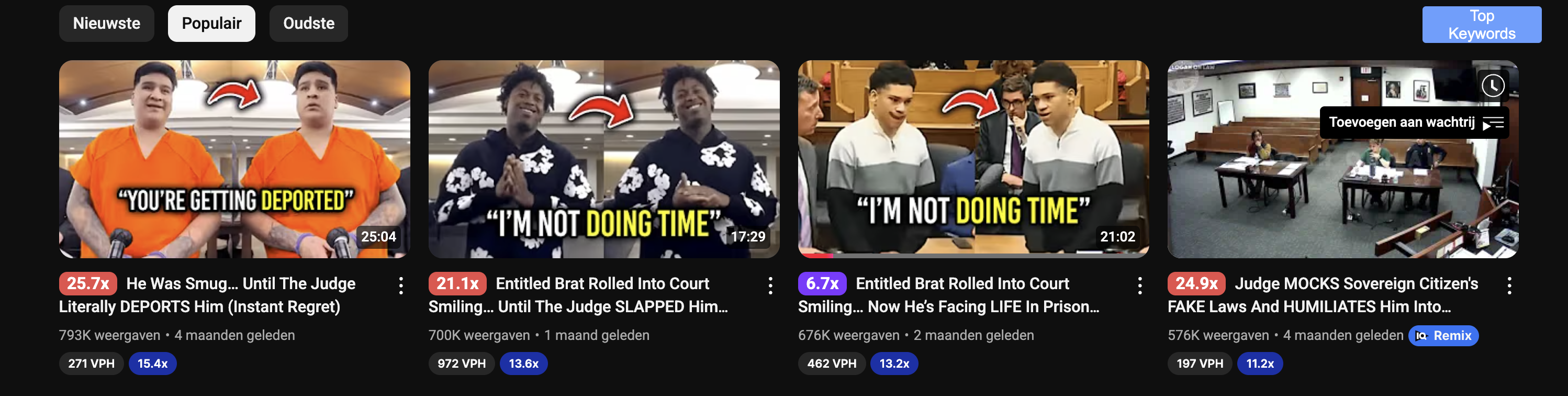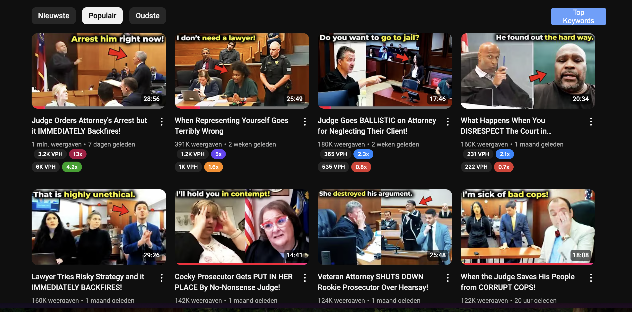 This niche works because it blends two things people love to watch: authority and failure. In almost every video, you’ve got a clash between a judge, a lawyer, or a defendant, and that alone creates drama. Sometimes the judge is the star in the topic like exploding, handing down punishment, or putting someone in their place. Other times it’s the lawyer or the defendant who looks arrogant or clueless and ends up embarrassing themselves. So if you take a loot at this niche, then you'll know that both sides work, because either way, the viewer knows they’re about to see conflict. A defendant trying to defend themselves and failing is just as clickable as a judge losing their cool. The real pattern is that people want to see someone get humbled, whether it’s authority going too far or someone overstepping in court. Just take a look at their most popular videos, and you'll notice the pattern I'm talking about: