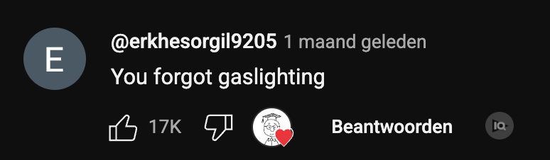 At first glance, this comment looks like criticism, but it’s actually sarcasm. The video already started with gaslighting, so the commenter is making a joke about it. What’s interesting is that this joke got 17K likes. That shows the audience not only recognizes these behaviors, but also enjoys pointing them out and analyzing them together. They’re clearly into topics like psychology, manipulation, and human behaviorf