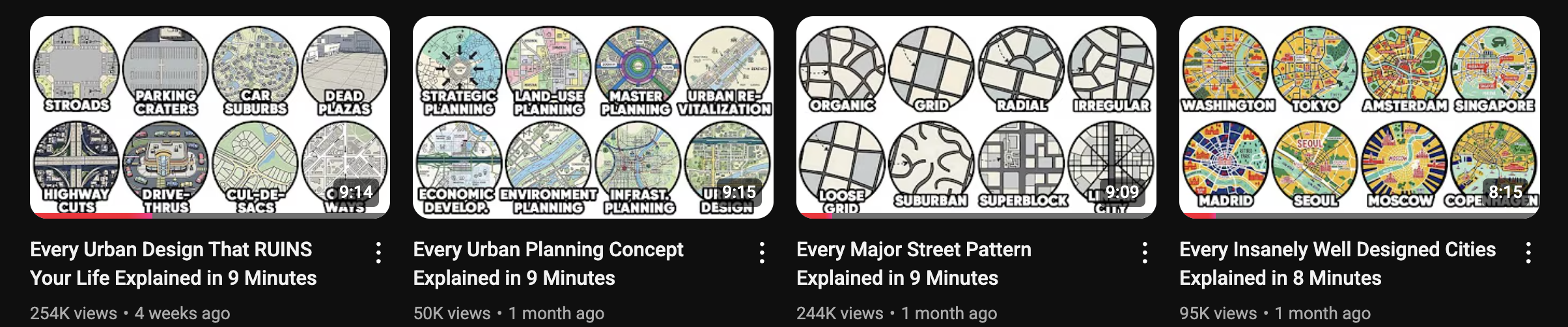 But...what makes the difference is the angle. The negative titles work the strongest because they feel personal and emotional. “Every Urban Design That RUINS Your Life” makes people stop and think, “Wait, is this happening to me right now?” That fear and urgency can be a huger trigger for a click. The positive titles also work, but they need to trigger words to make them strong enough. “Every Insanely Well Designed Cities” wouldn’t perform the same if it just said “well-designed,” but with “insanely” it creates excitement and it's possible this makes people want to check if their own city made the list. Even the neutral ones like “Every Major Street Pattern” can do well, simply because the topic itself sparks curiosity and FOMO. Everyone lives in some kind of street pattern, and people want to know which one they belong to.