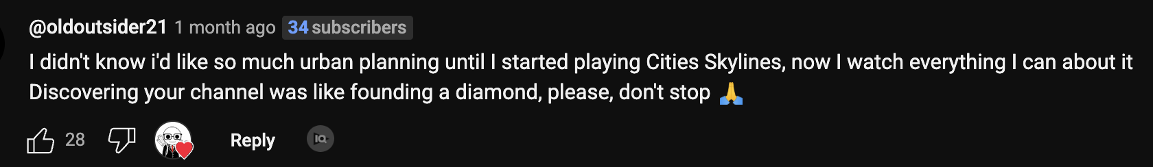 What I’ve noticed is that a lot of viewers are coming from the Minecraft and Cities: Skylines crowd, and that’s how they end up in the algorithm for urban planning videos. You can see this in the comment below that got over 1K likes because it’s a clear sign of where part of the audience is coming from, and definitely something to keep in mind.